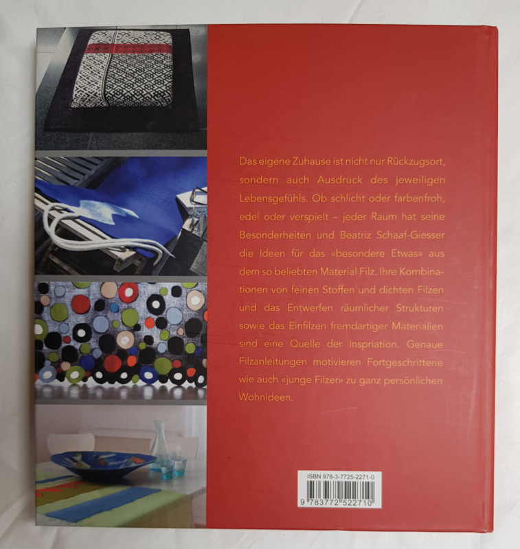 Filz, Form und Farbe leiten durch das Buch der Textildesignerin Beatriz Schaaf-Giesser, deren intensive Auseinandersetzung mit diesem Material und seiner Formbarkeit die Grundlage ihrer Arbeit bilden. Ihr Buch bietet sowohl Grundkenntnisse als auch anregende Ergänzungen für Fortgeschrittene, die sich kreativ mit dem so vielfältigen Material Filz und seinen Möglichkeiten beschäftigen möchten. Dabei geht Beatriz Schaaf-Giesser über den Bereich des Selbstgemachten hinaus und bietet anspruchsvolle Präsentationen von Einrichtungssituationen. Farblich abgesetzte Kapitel leiten durch Stimmungen und Räume und lassen schon beim Betrachten die Lust am Gestalten entstehen.