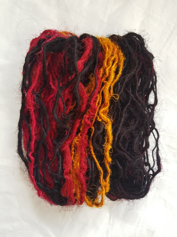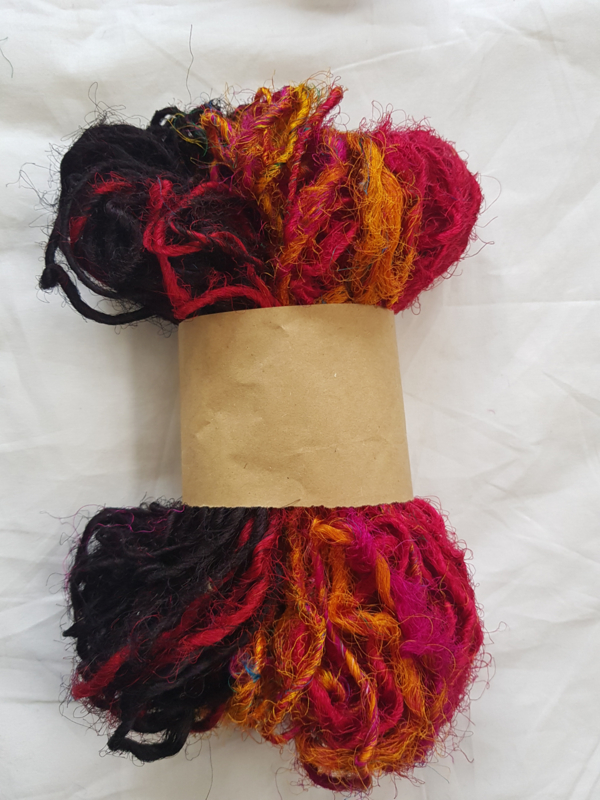 Zijdevezels, gerecyclede saritextiel, gesponnen, 46 g.