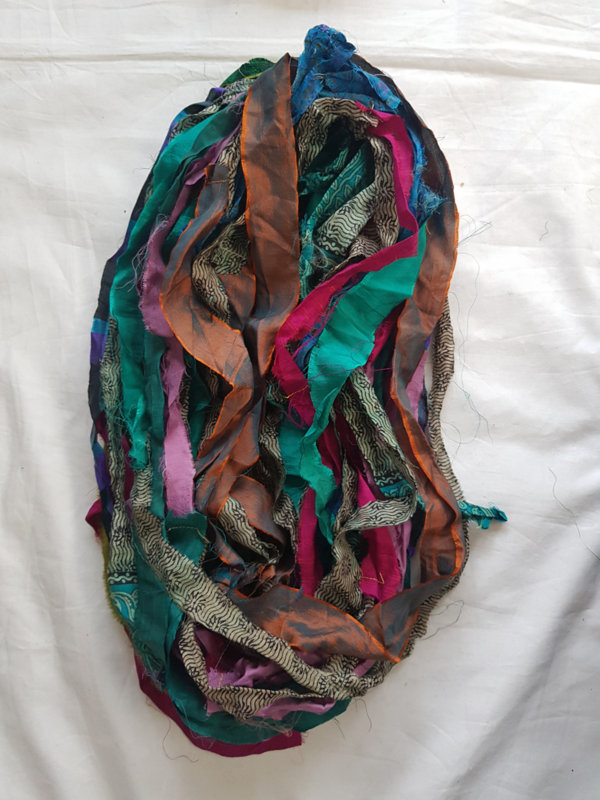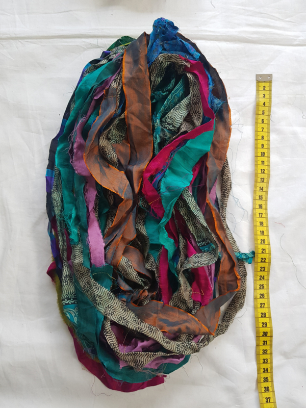 Zijdelinten, van gerecyclede sarizijde textiel. Heel divers, breed, smal, kan los zijn/aan elkaar genaaid, kunnen scheurtjes in zitten, gaatjes, bij elkaar in ieder geval ca 20 meter.