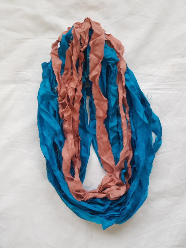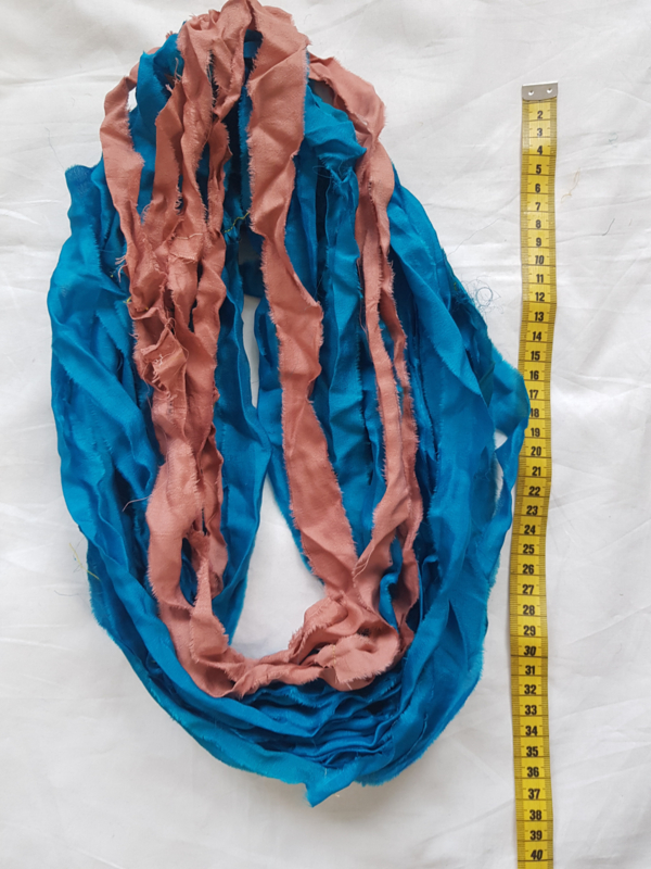 Zijdelinten, van gerecyclede sarizijde textiel. Heel divers, breed, smal, kan los zijn/aan elkaar genaaid, kunnen scheurtjes in zitten, gaatjes, bij elkaar in ieder geval ca 20 meter.