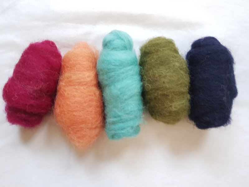 Gekaarde wol, assorti van 5 kleuren, totaal ca 50 gram, diverse Nieuw Zeelandse schapenrassen.