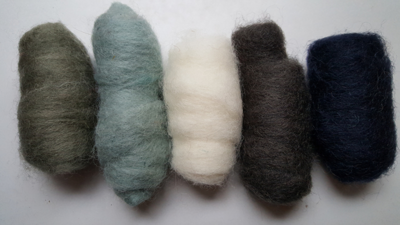 Gekaarde wol, assorti van 5 kleuren, totaal ca 50 gram, diverse Nieuw Zeelandse schapenrassen.
