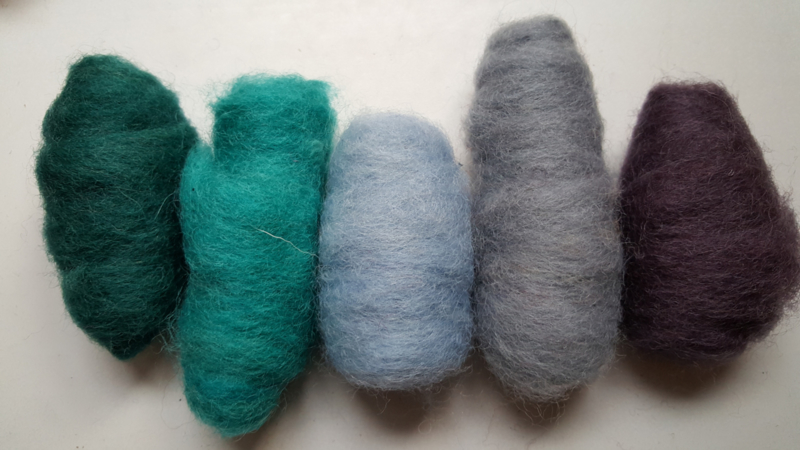 Gekaarde wol, assorti van 5 kleuren, totaal ca 50 gram, diverse Nieuw Zeelandse schapenrassen.