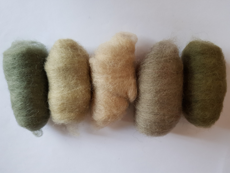 Gekaarde wol, assorti van 5 kleuren, totaal ca 50 gram, diverse Nieuw Zeelandse schapenrassen.