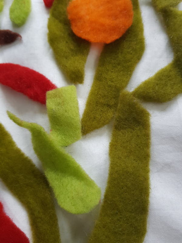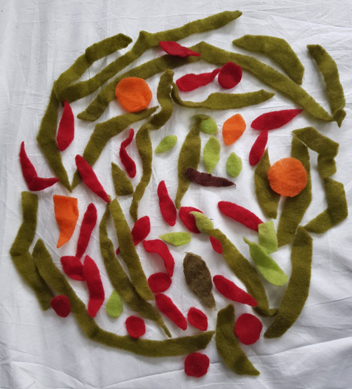 Stukjes naaldvilt, restanten van een groter project, rood, oranje, groen.